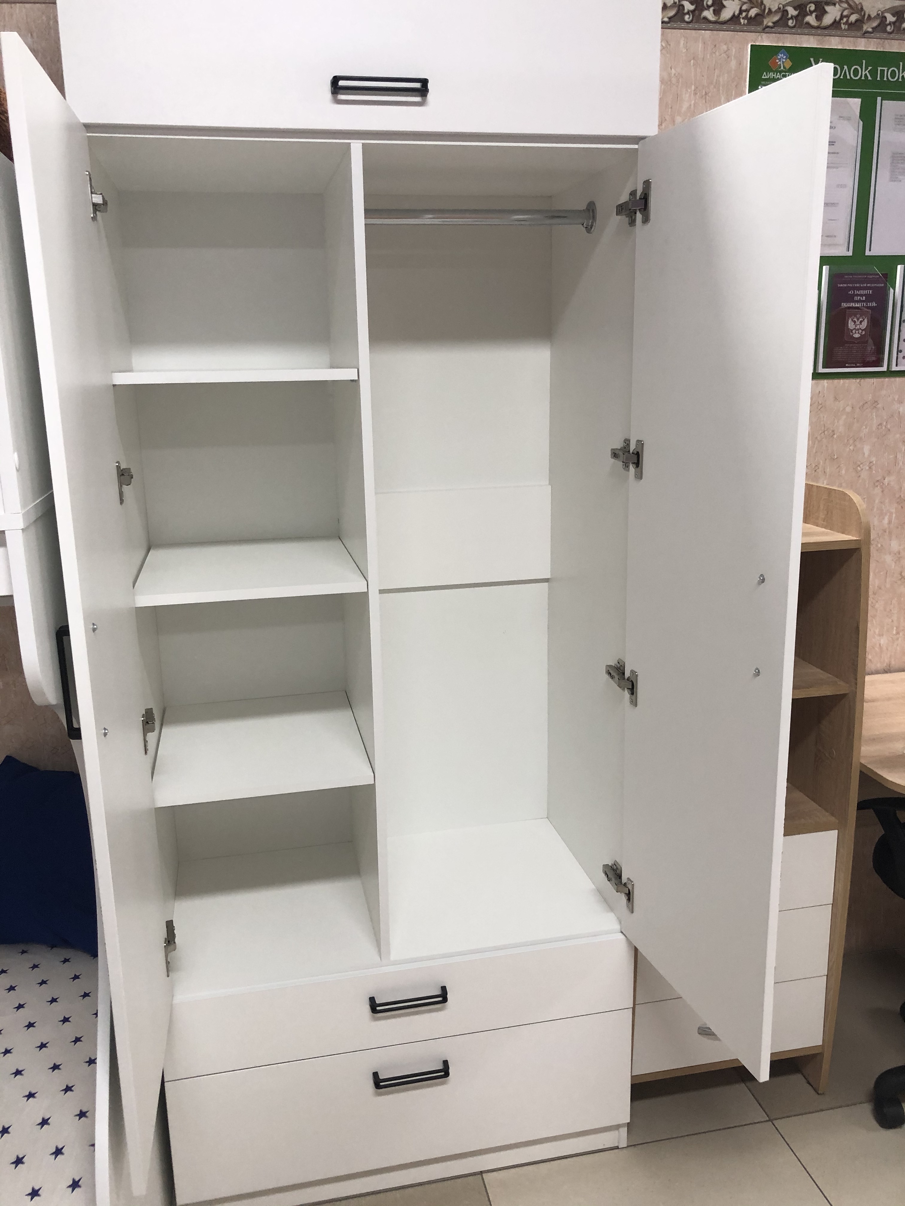 Внутри шкафа имеются штанга и боковые полки.