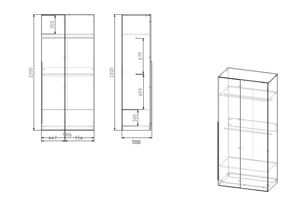 Внутри шкафа расположены две штанги, верхняя и нижняя полки.