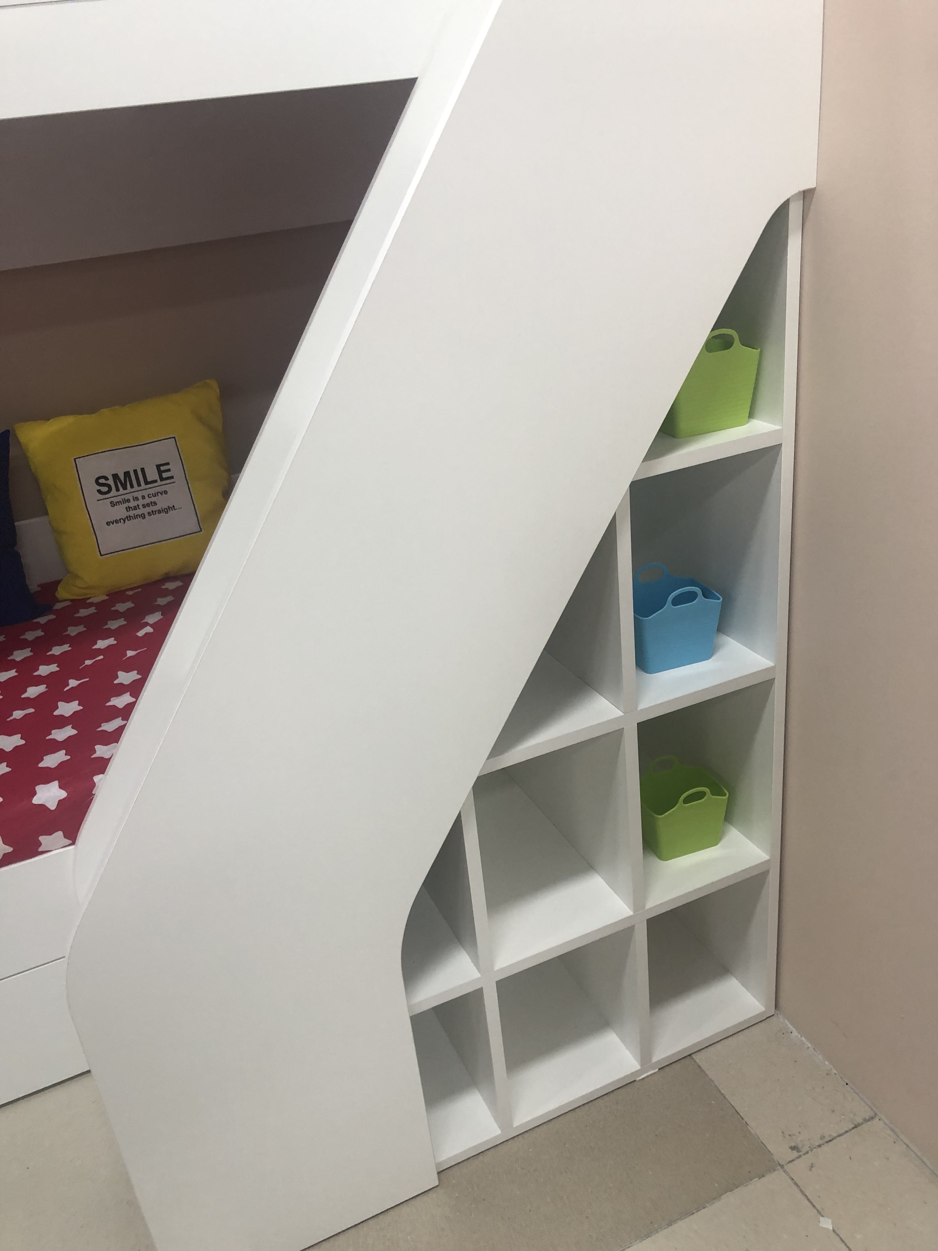 Удобная, безопасная лестница со встроенными полочками для книг и игрушек и комфортная высота кровати.