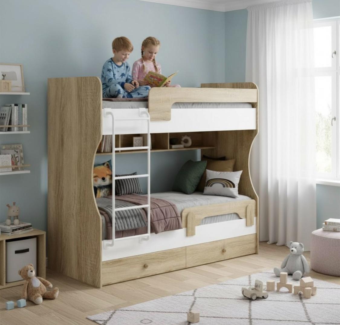 Двухъярусная кровать в декоре под дерево идеальна для любых интерьеров.