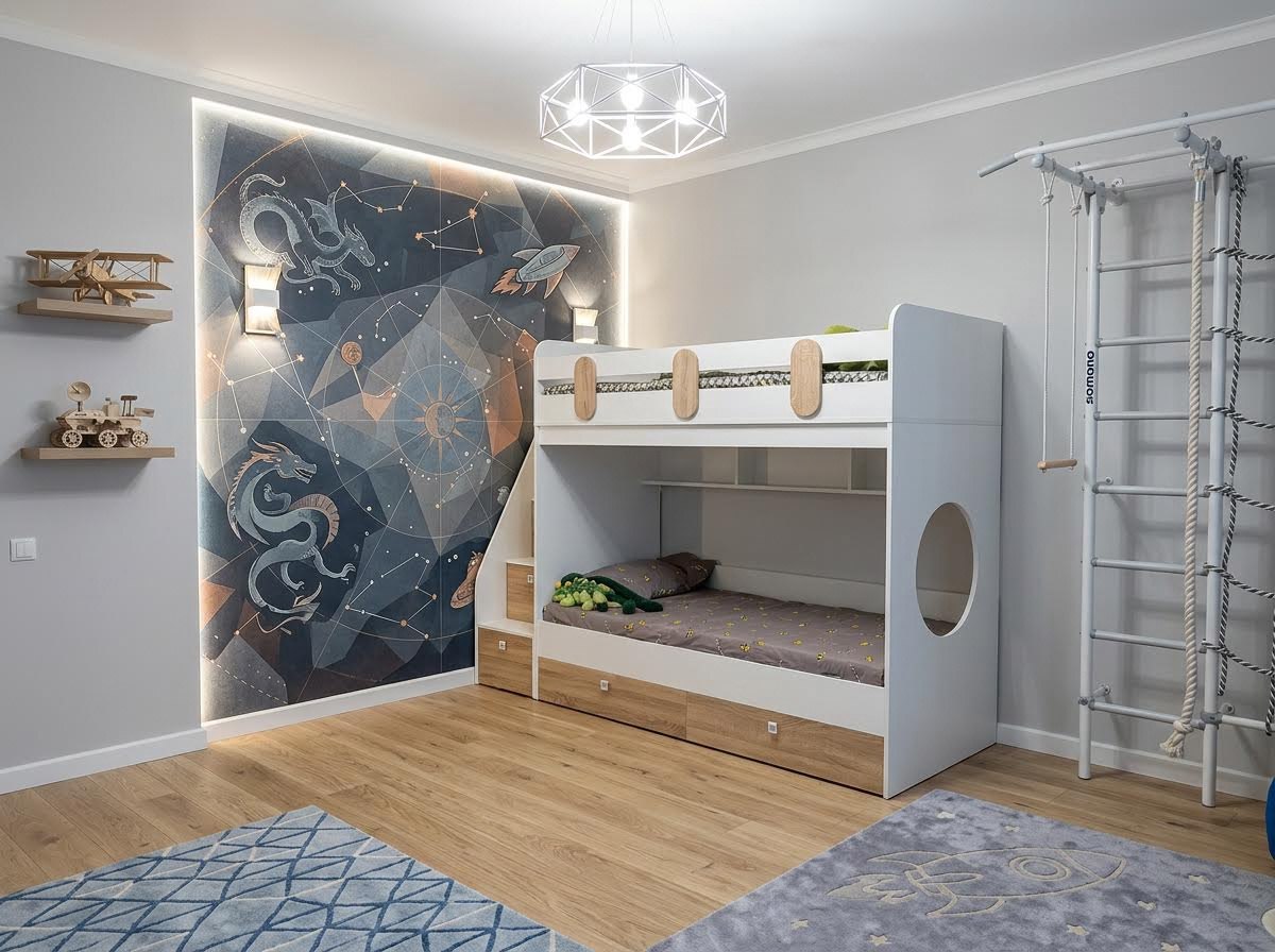 Выдвижные ящики в нижней кровати имеют глубину 450 мм, высоту 150 мм