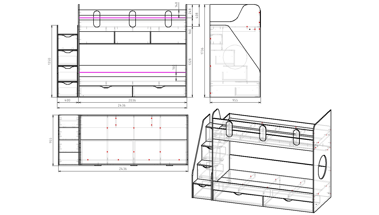 Габариты кровати с учетом лестницы: ширина 2436 х высота 1736 х глубина 955 мм