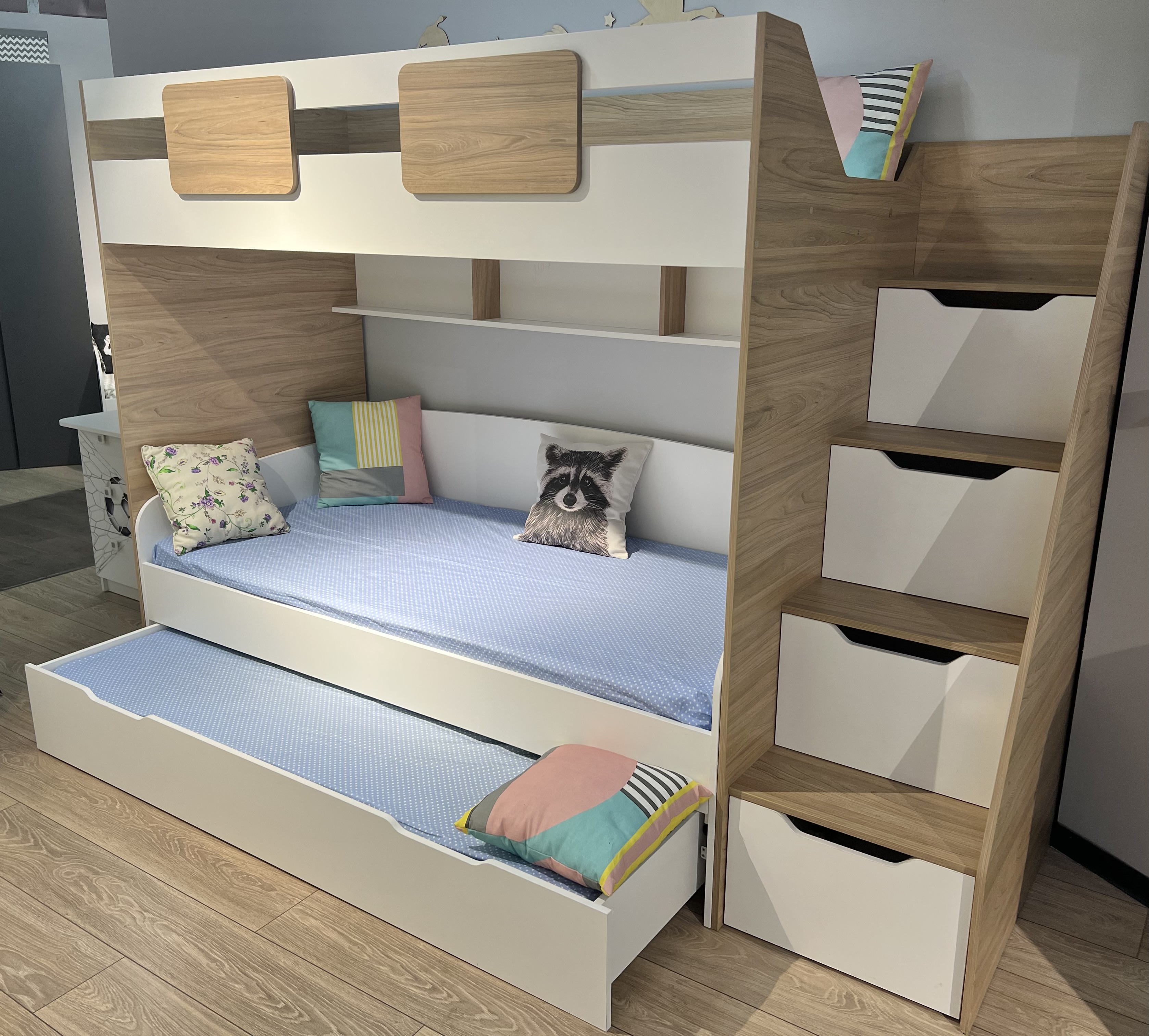 В лестницу встроены выдвижные ящики для игрушек - удобно и практично.