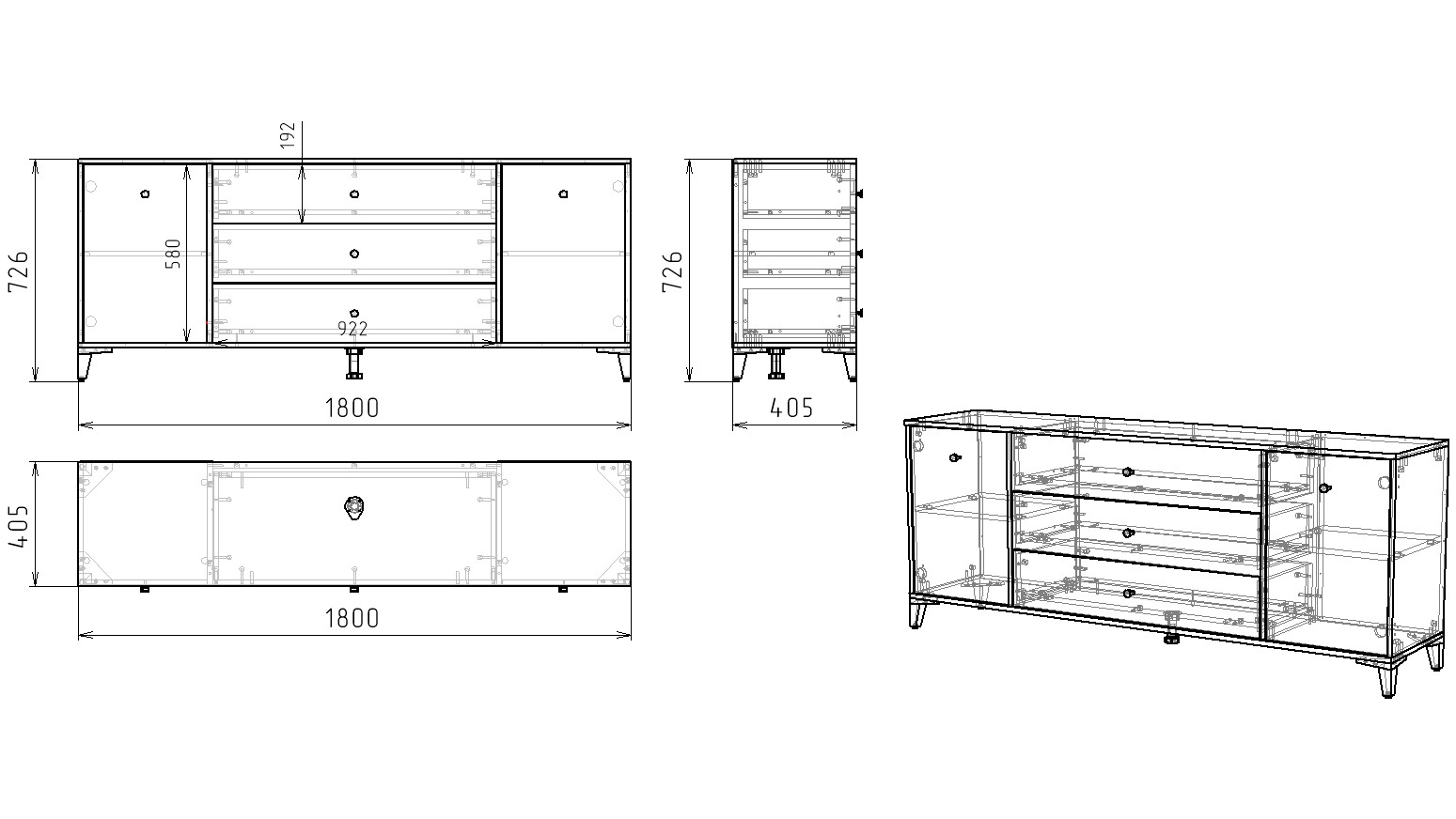 Габариты тумбы: ширина 1800, глубина 405, высота 726 мм