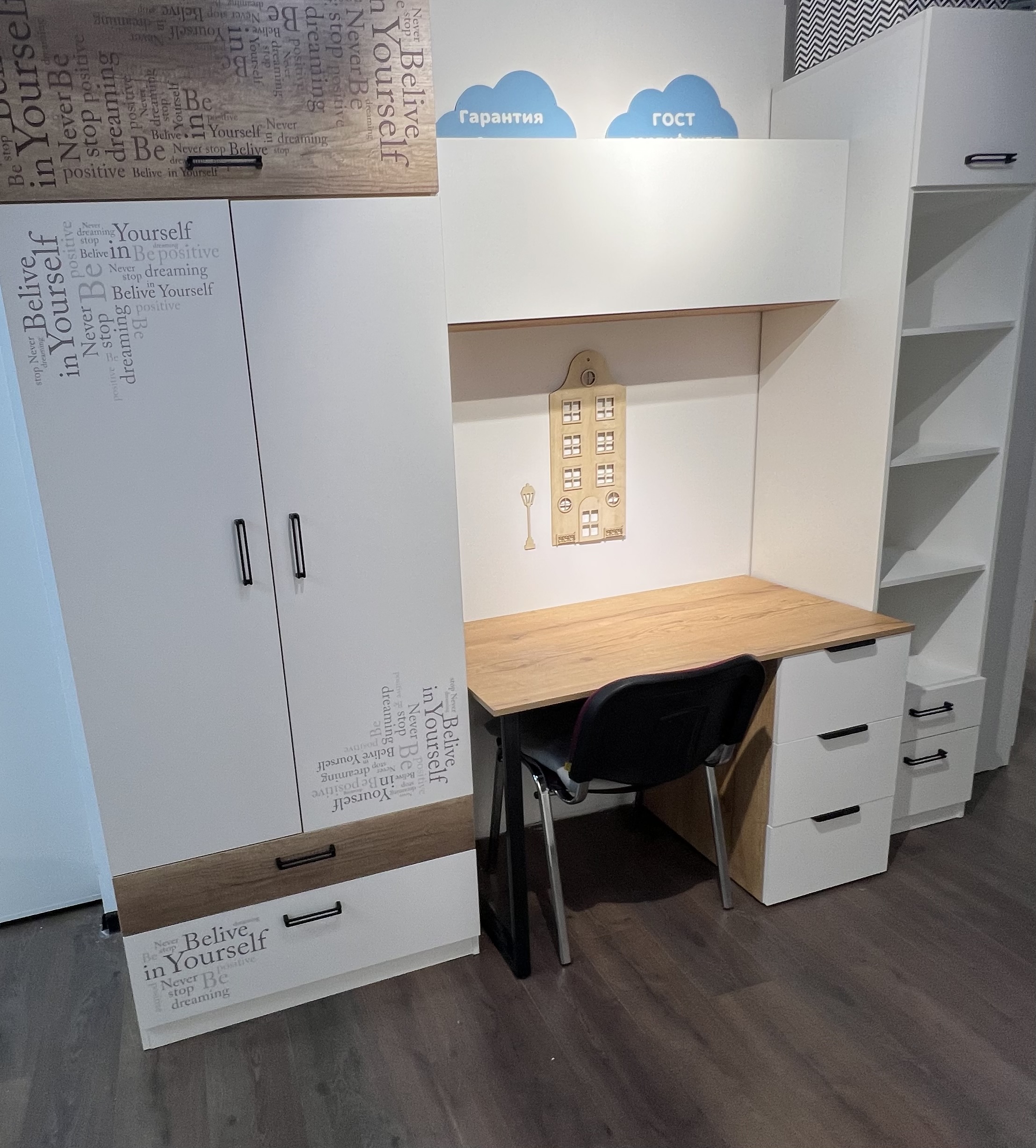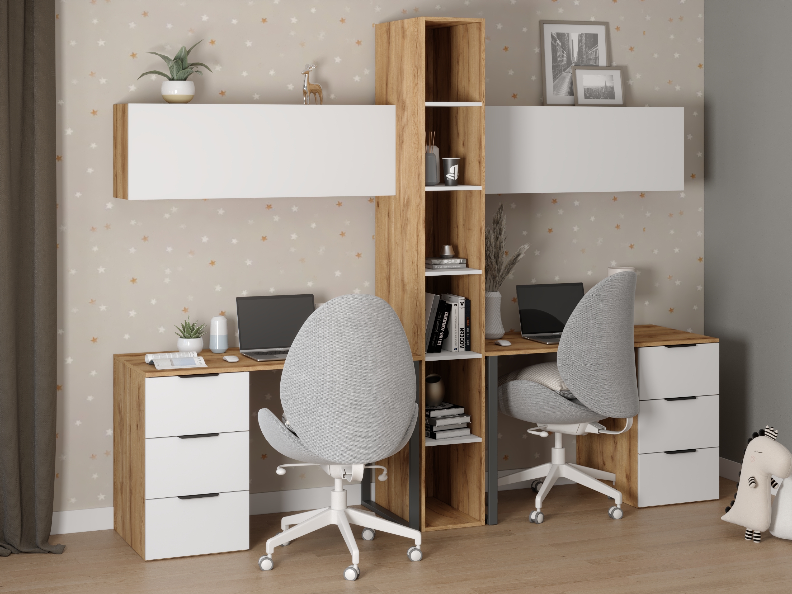 стол (2 шт) + стеллаж узкий переходной + полка настенная (2 шт)