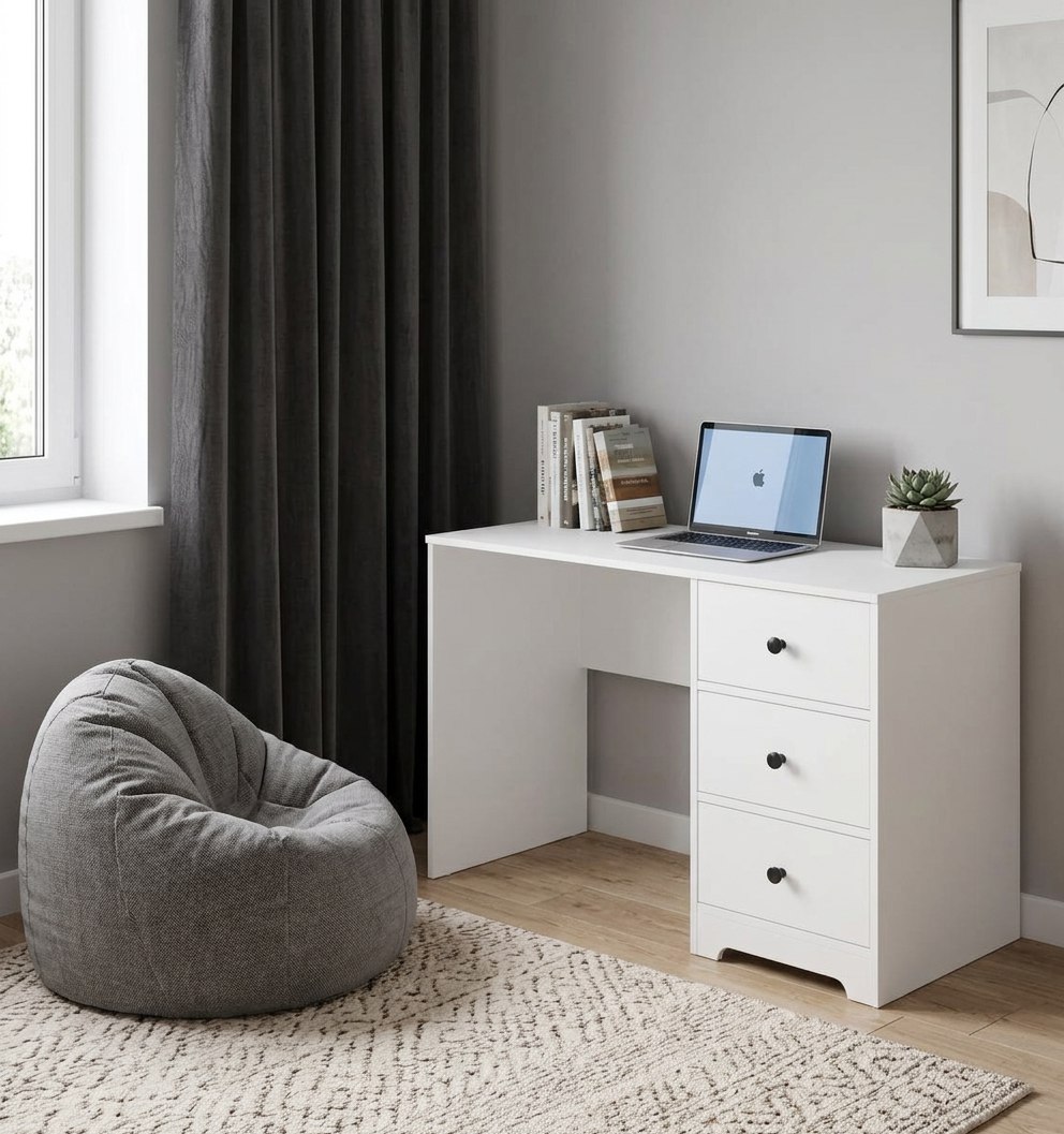 В стол встроены три выдвижных ящика на направляющих скрытого монтажа с доводчиками.