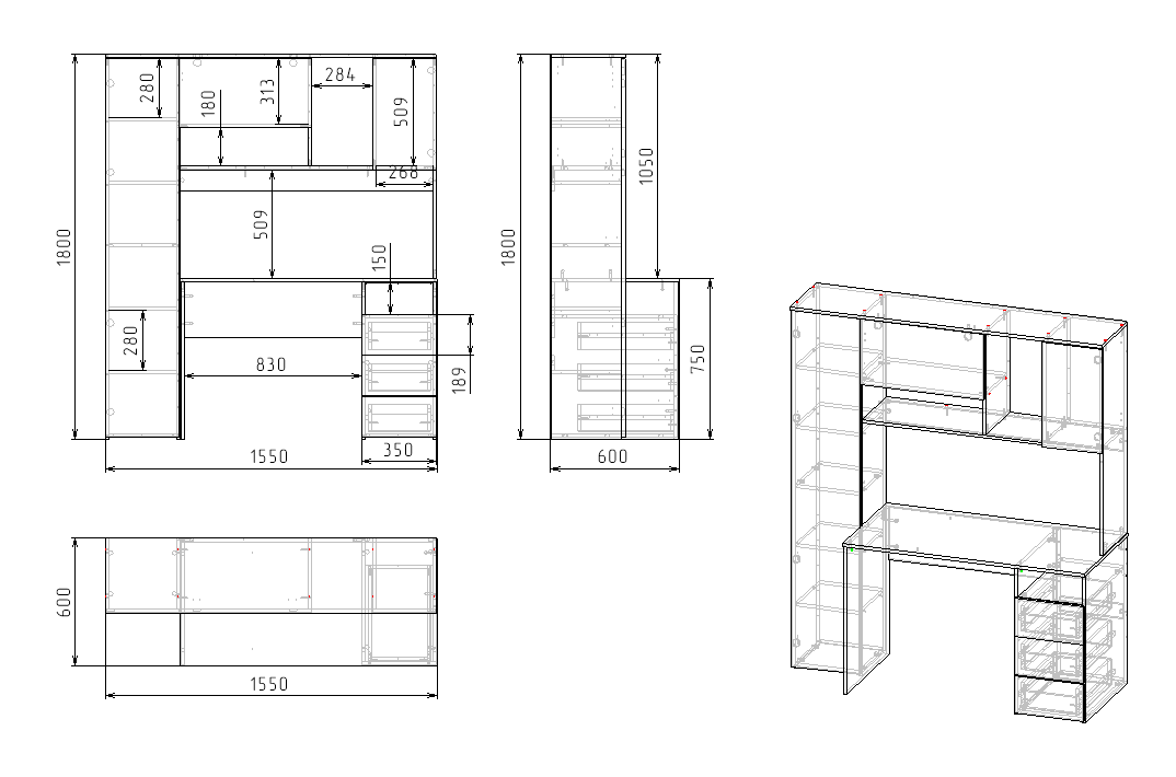Габариты стола: ширина 1550, глубина 600, высота 1800 мм