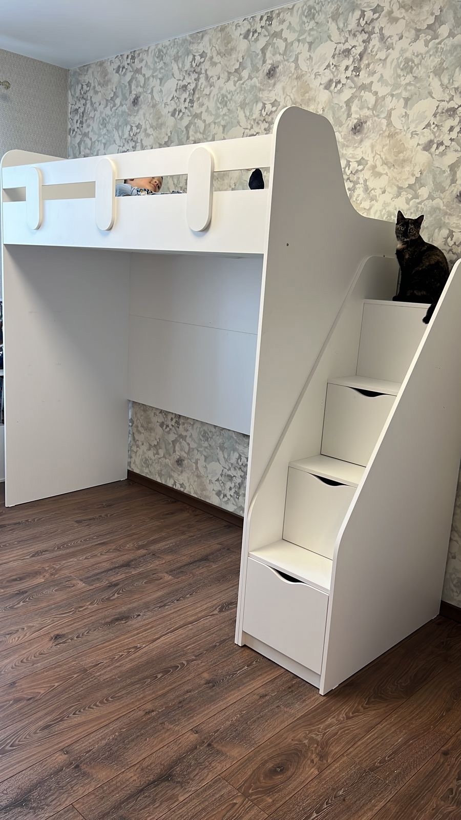 В лестницу встроены выдвижные ящики для игрушек - удобно и практично.