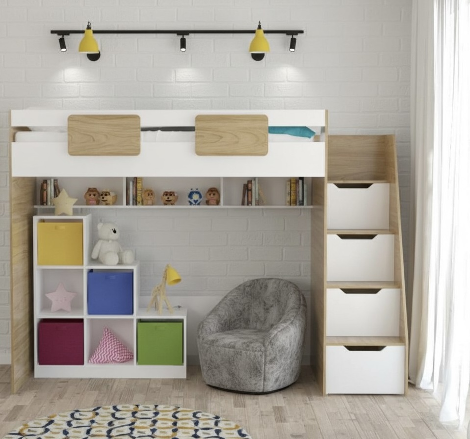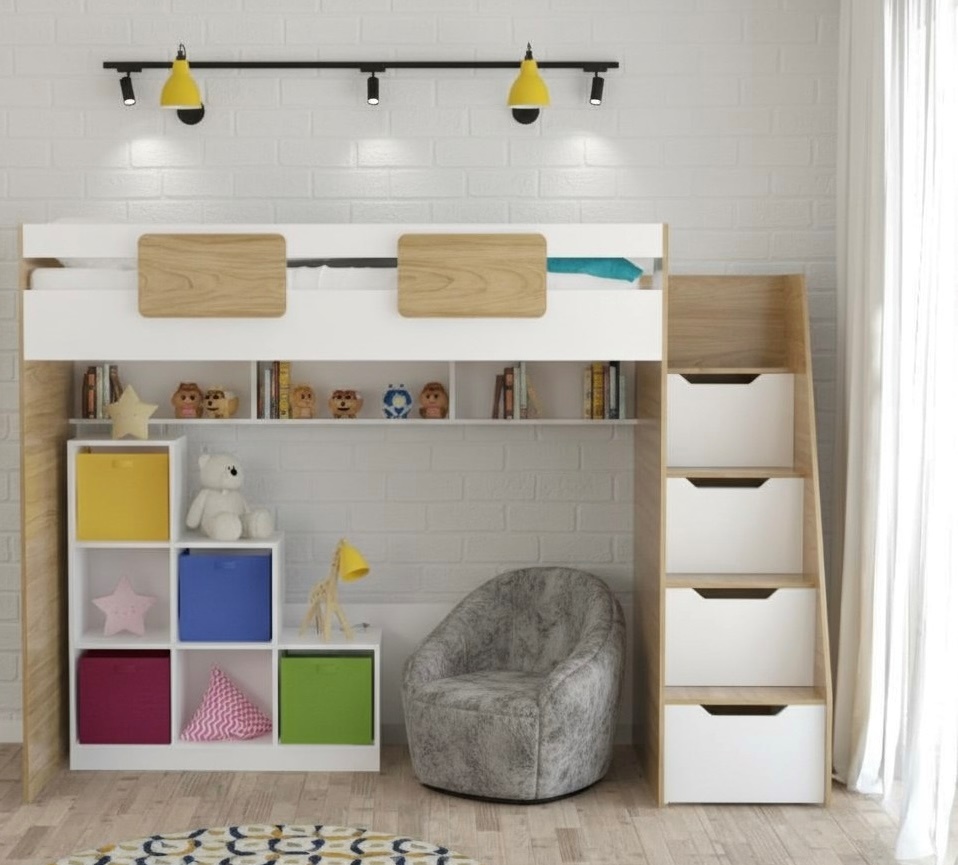 Кровать-чердак Мозаика (правый/левый) + Стеллаж универсальный в белом цвете (правый/левый)