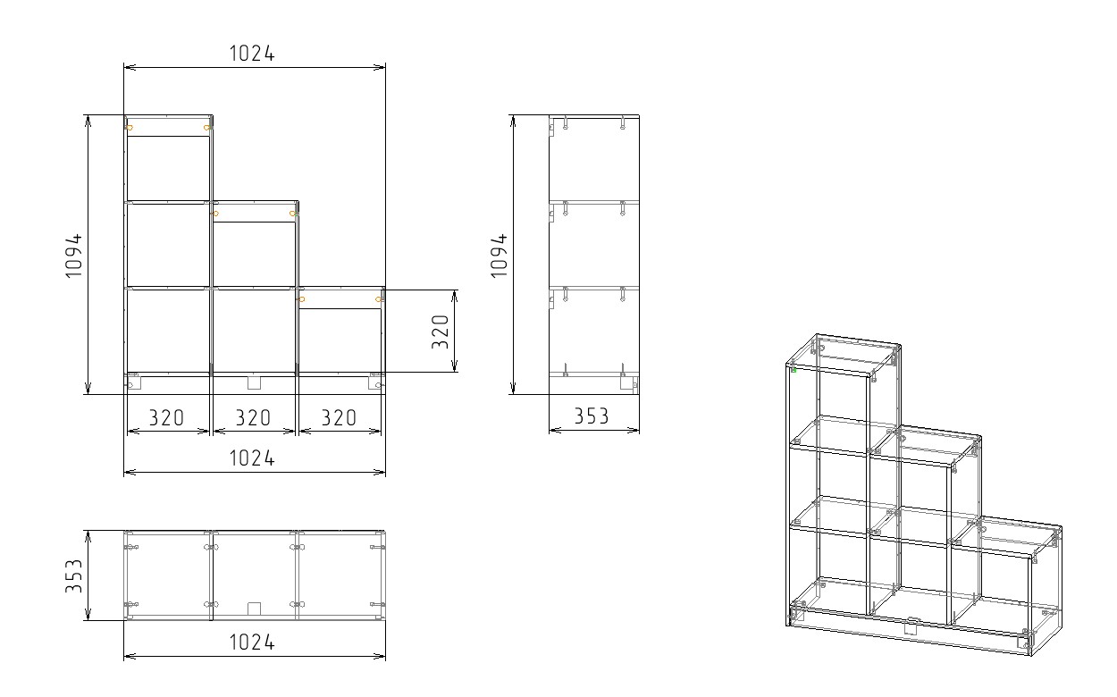 Габариты стеллажа: высота 1094, глубина 350, ширина 1024 мм
