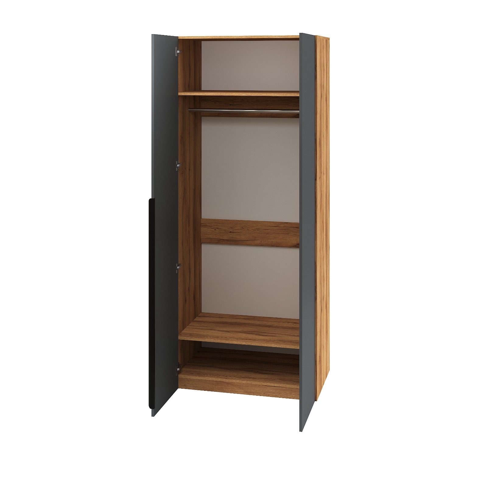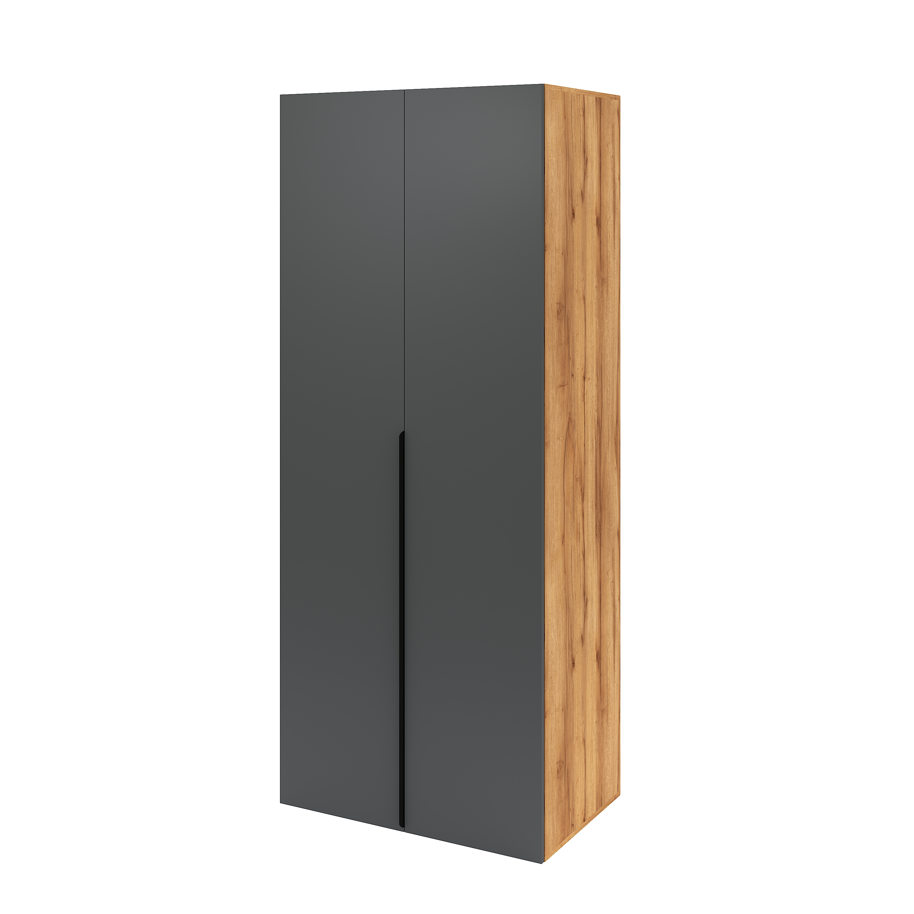 Натуральный декор дуб золотистый с выразительными полосами и следами от сучков прекрасно сочетается с однотонным декором графит.