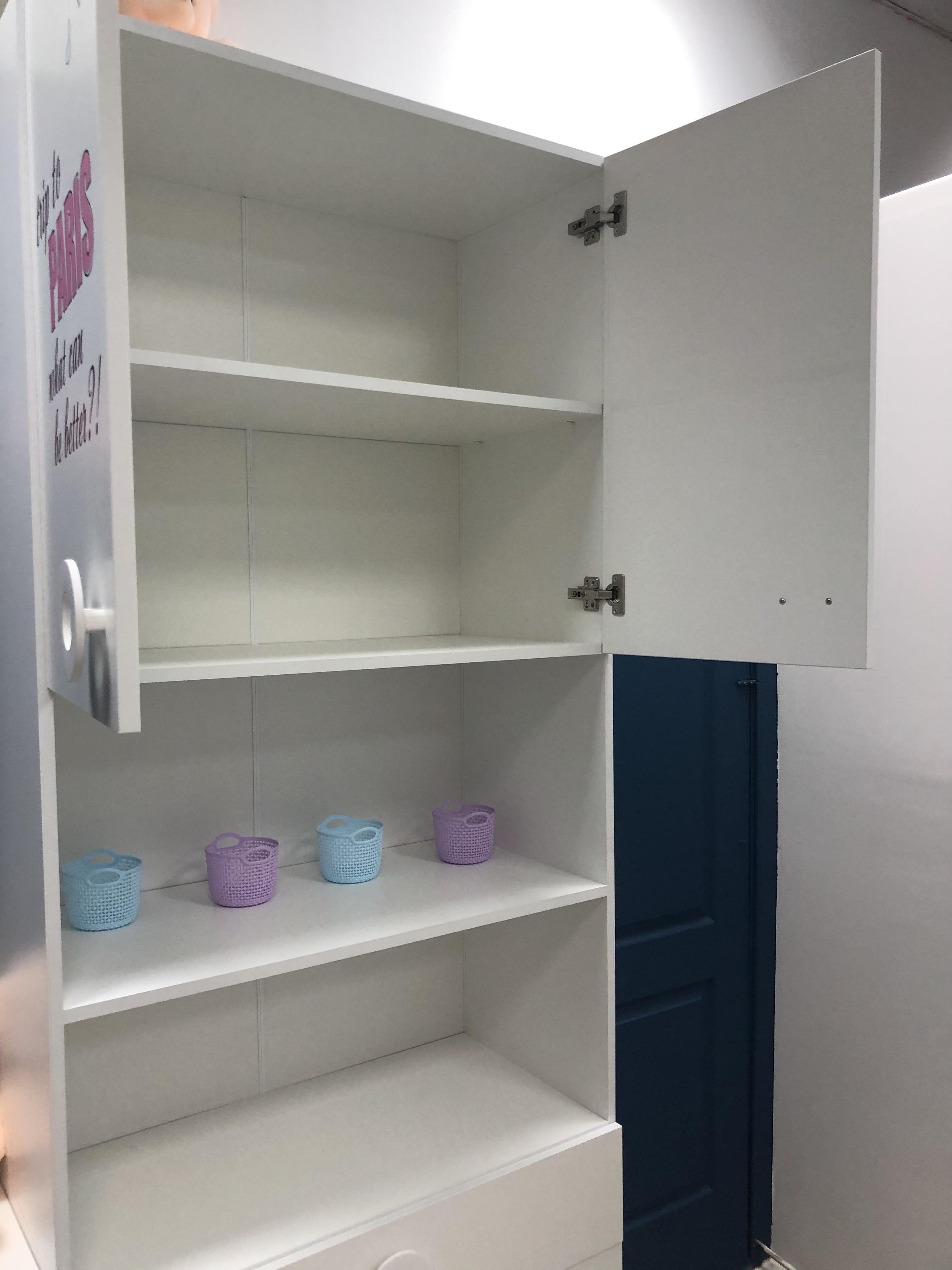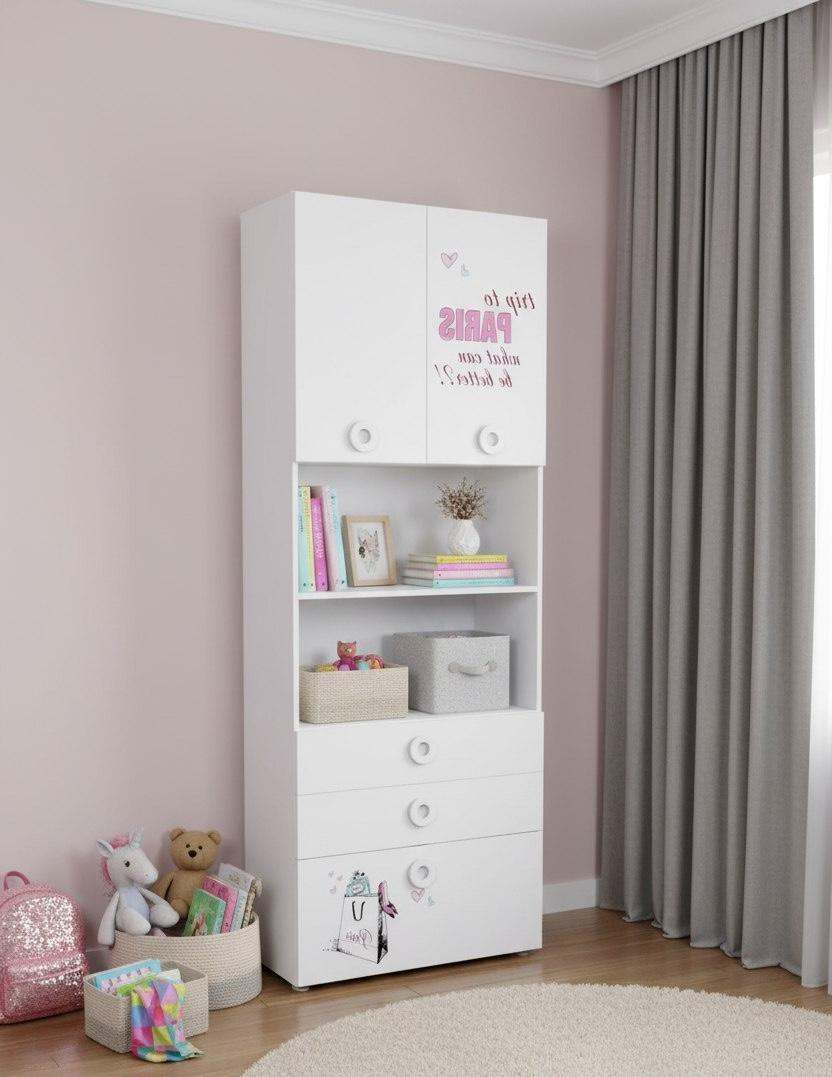 Стеллаж выполнен из сертифицированного, качественного, экологически чистого ЛДСП Е0,5 в белом цвете с принтом.