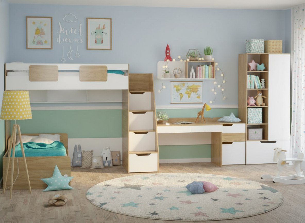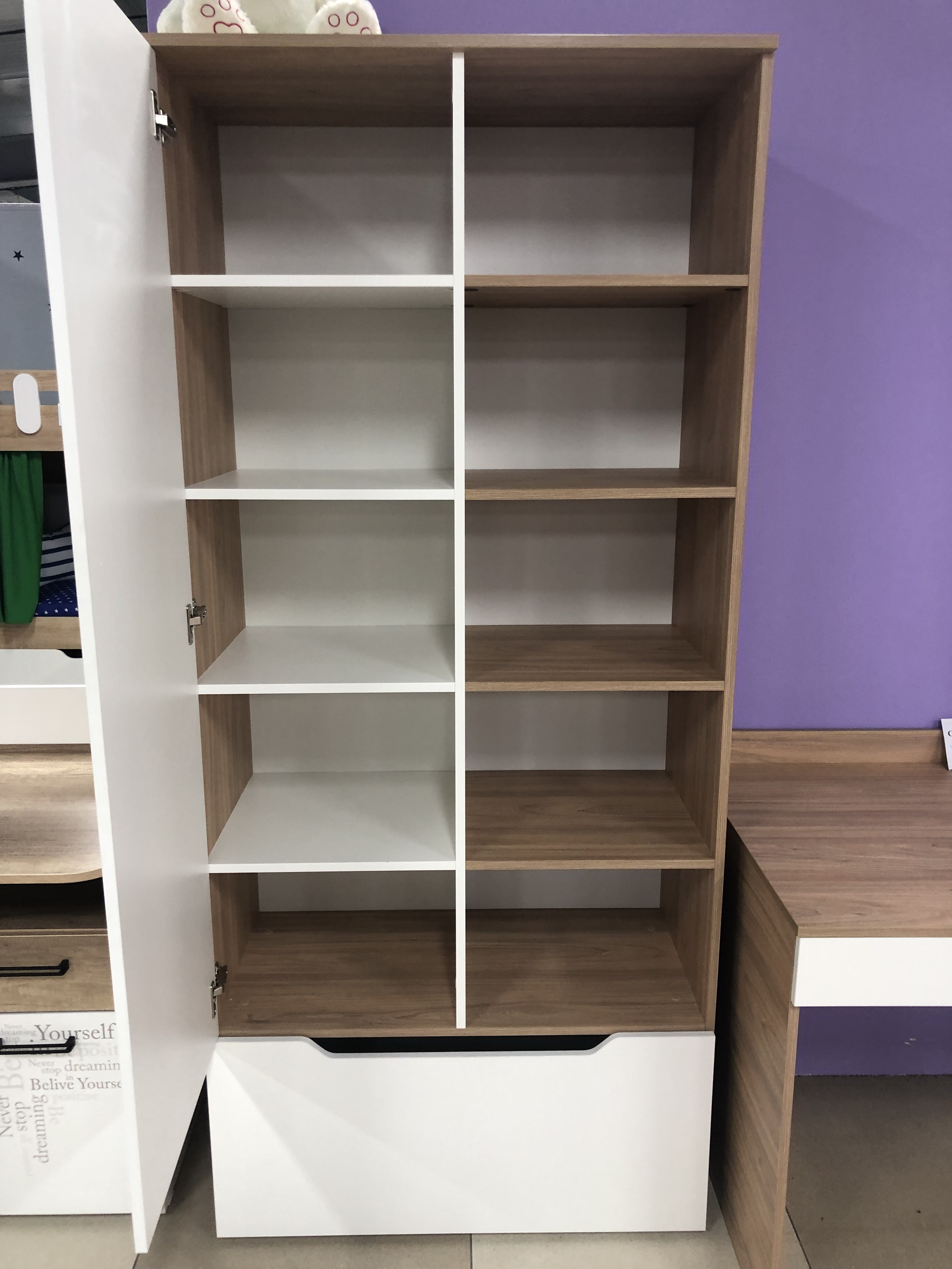кровать односпальная + кровать-чердак + стол + тумба для стола + полка навесная + шкаф-стеллаж