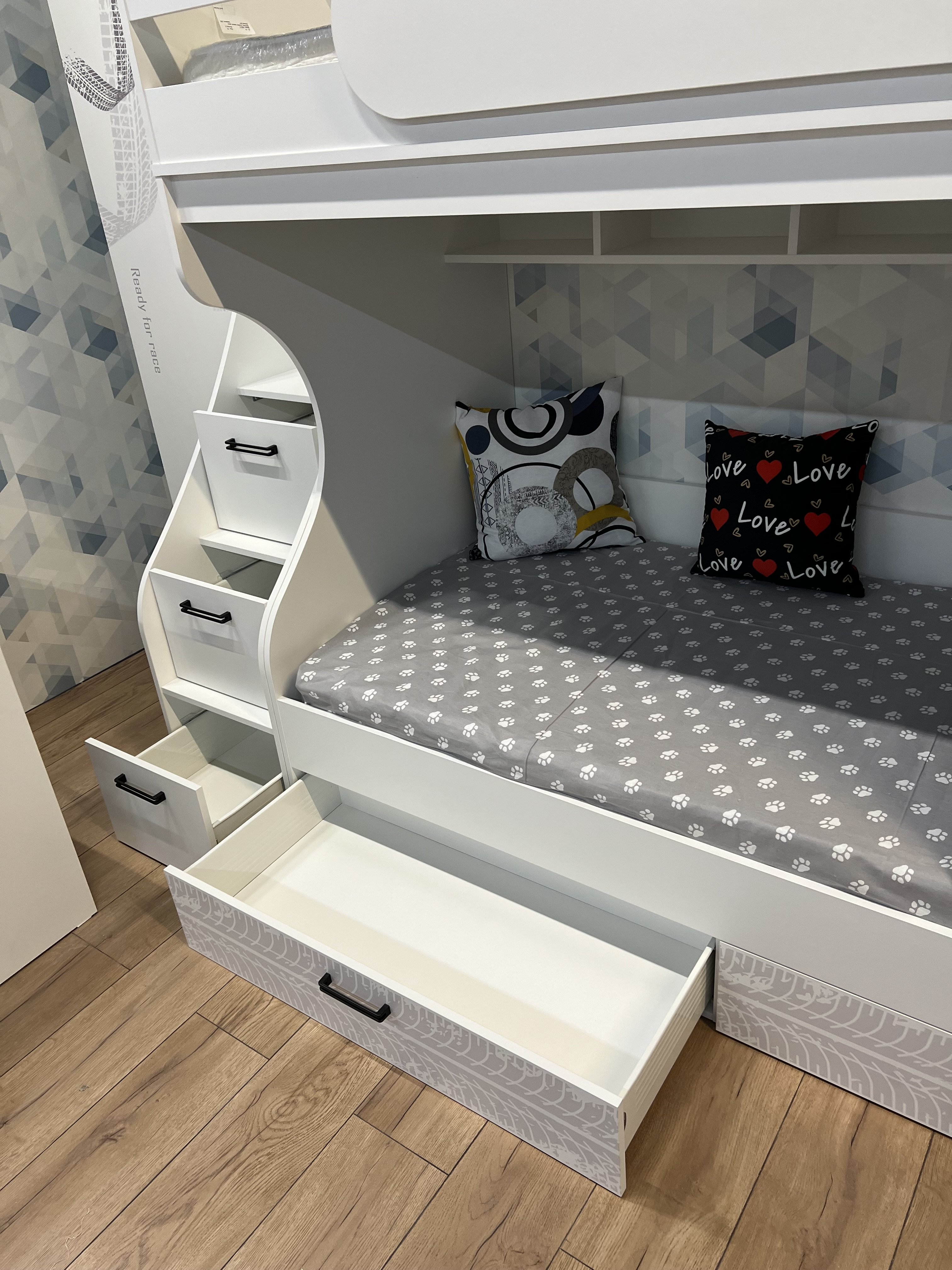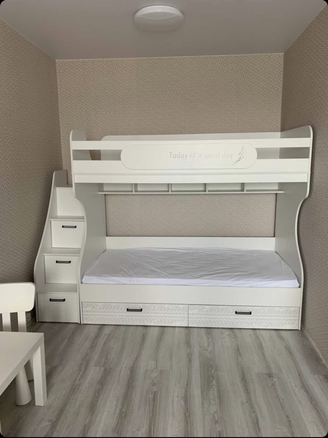 Вместо них - цельный и прочный настил из ЛДСП, который выдерживает сверхвысокую нагрузку и позволяет расположиться даже взрослому с ребенком.