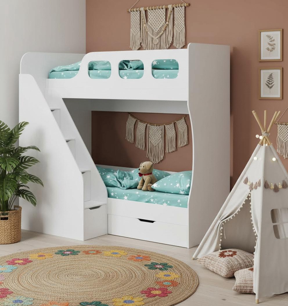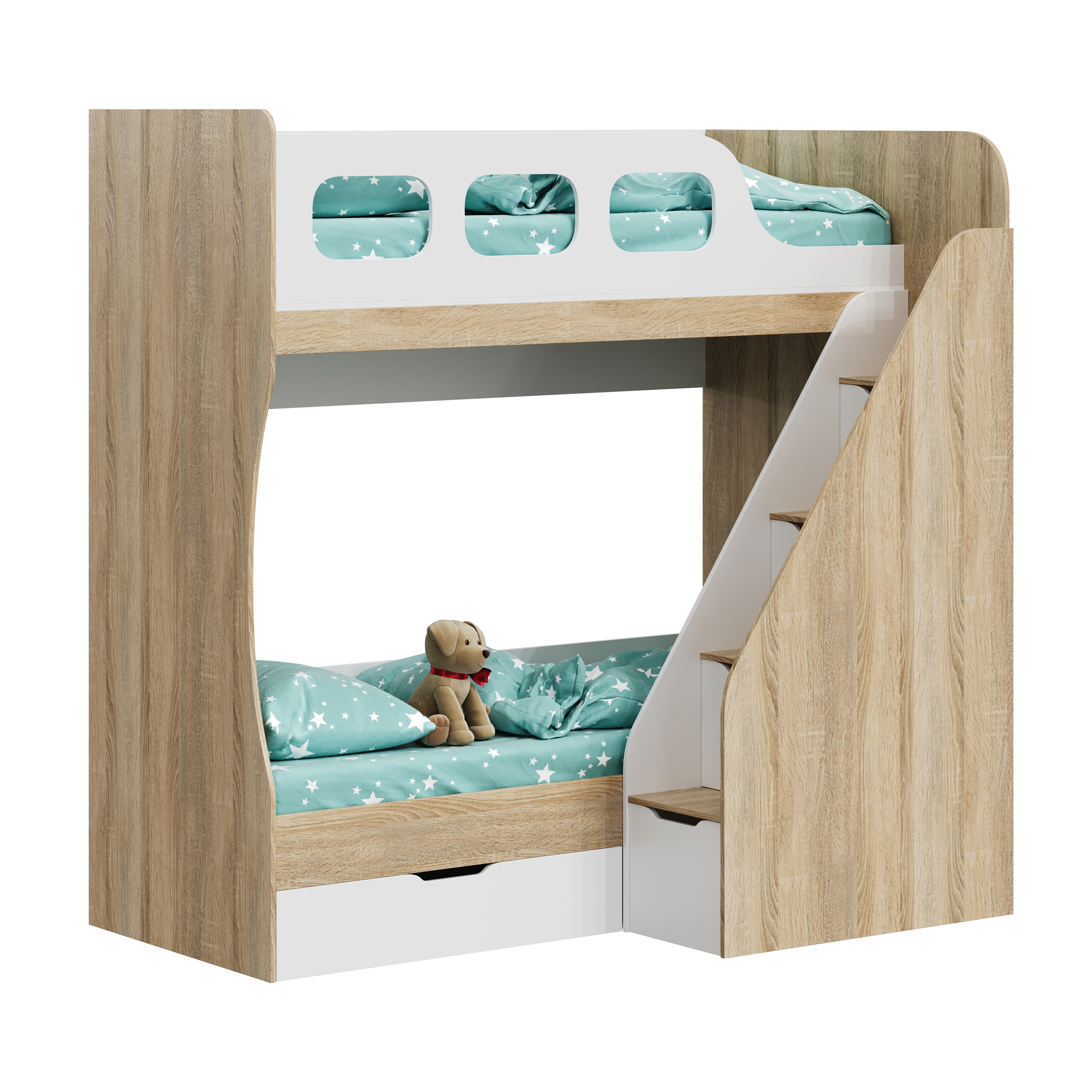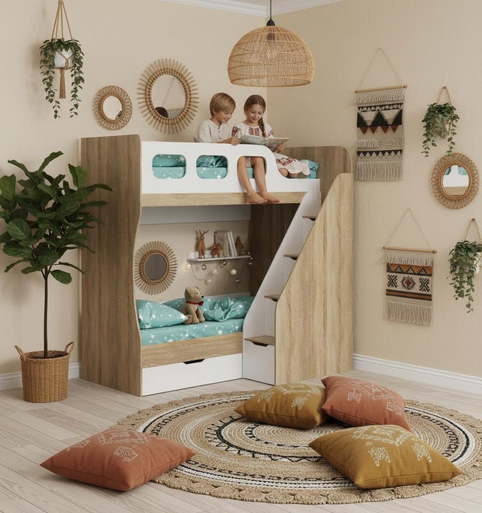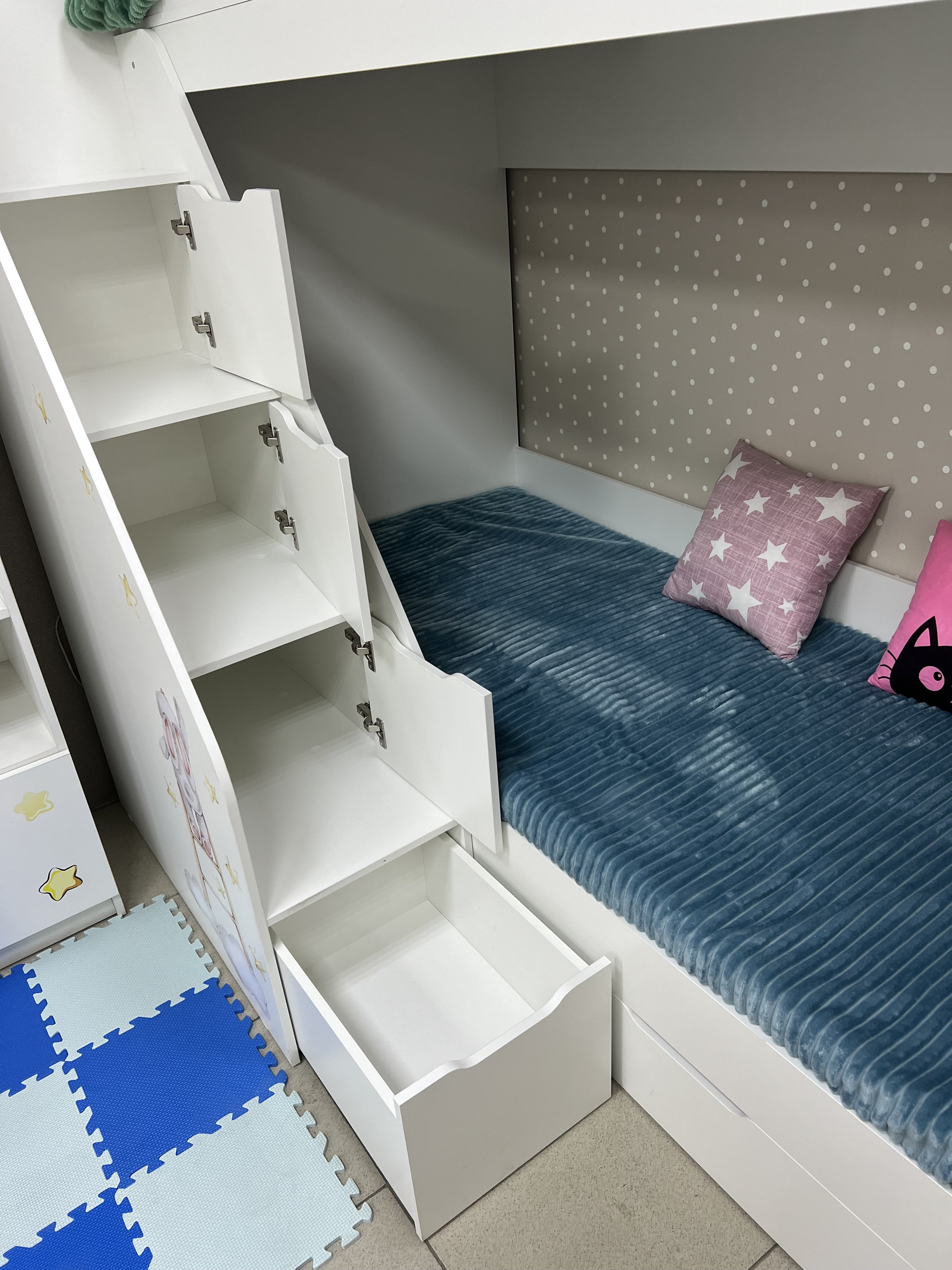Высокая нагрузка на спальные места. Удобная лестница с ящиками. Высокий, безопасный бортик |