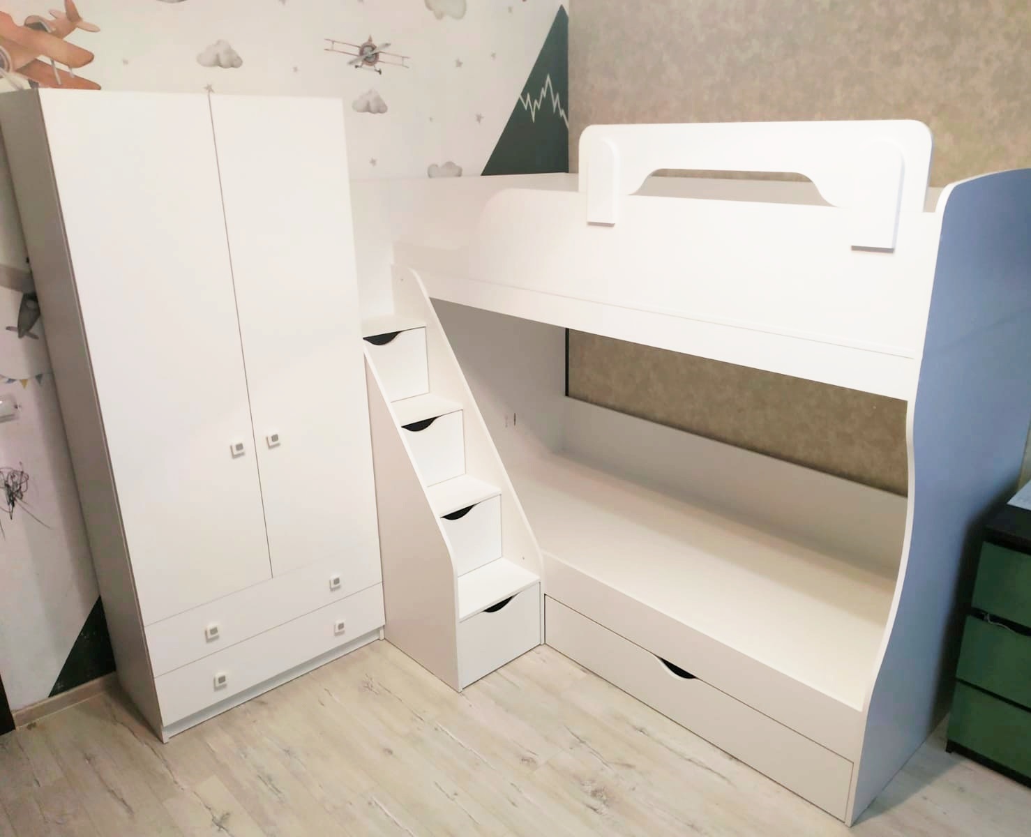 В нижнюю кровать встроен выдвижной ящик для белья и игрушек.