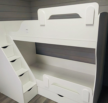 Преимущества данной модели - удобная, безопасная лестница с ящиками для игрушек и комфортная высота кровати.