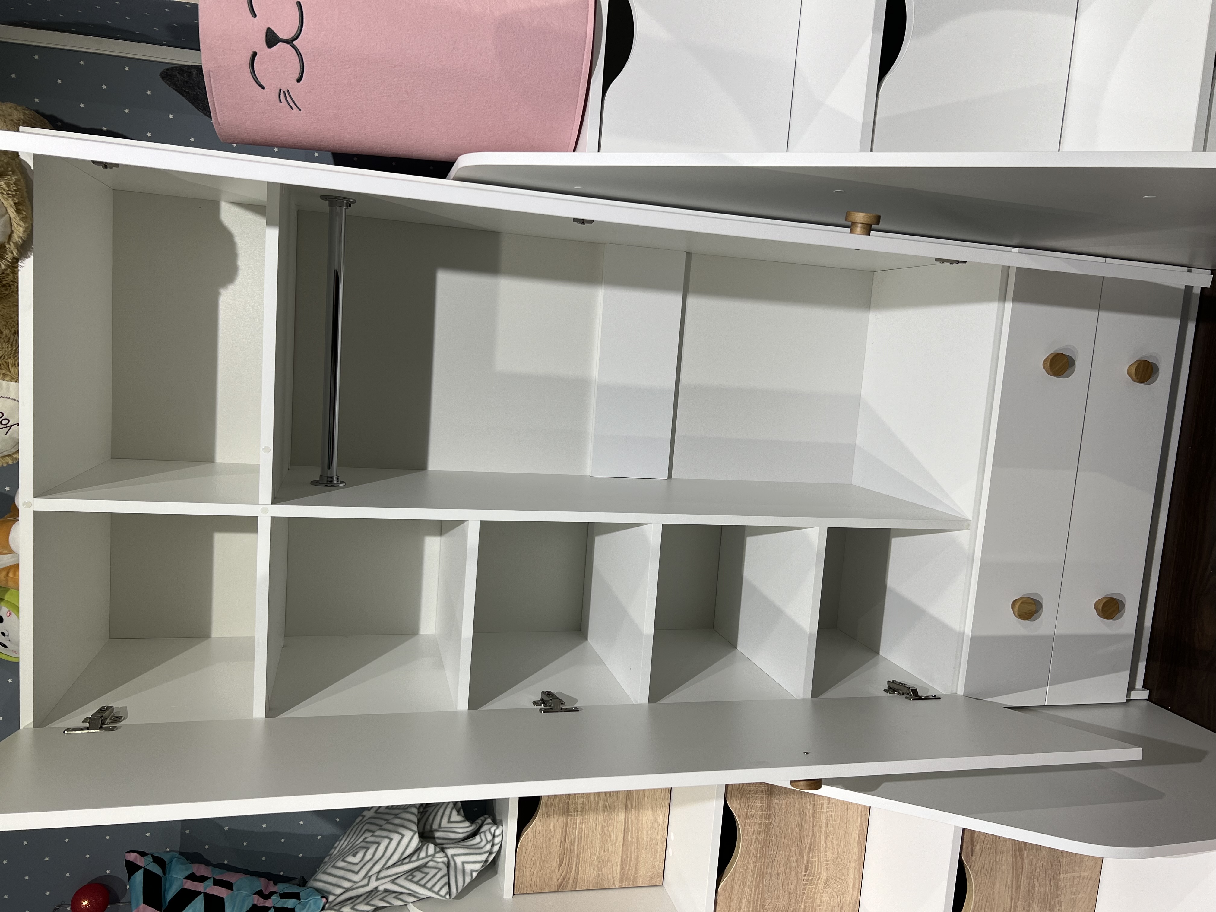 Внутри шкафа имеются штанга для вещей и дополнительные боковые полки.