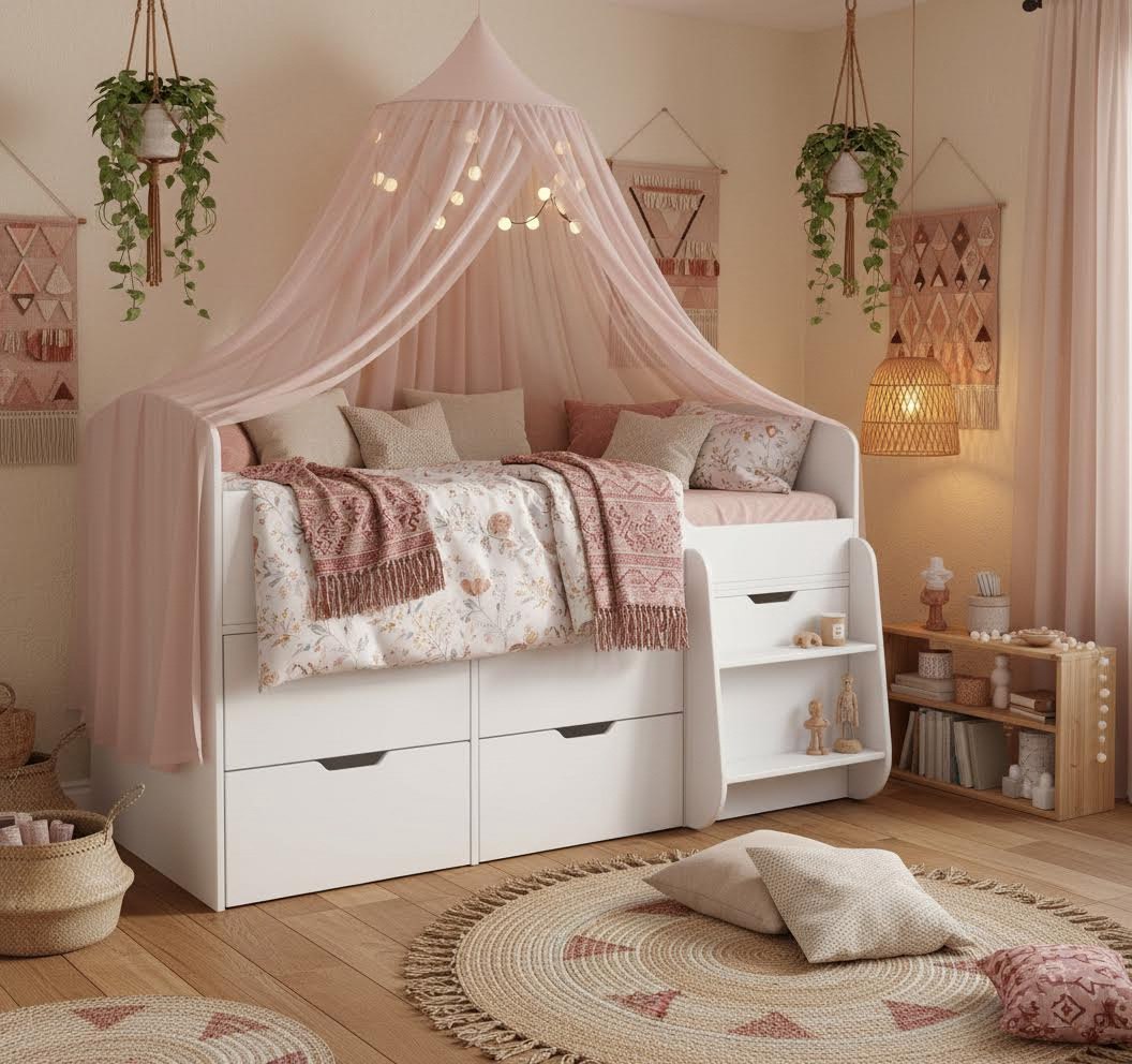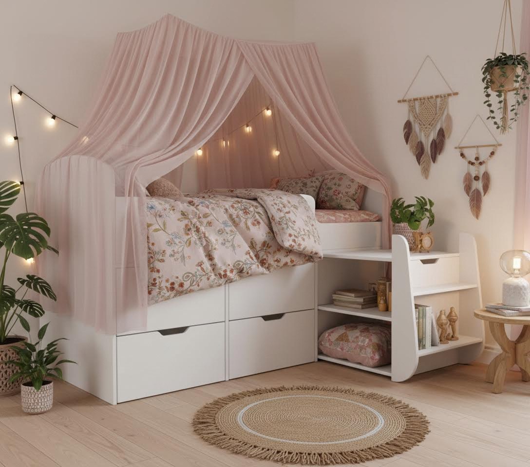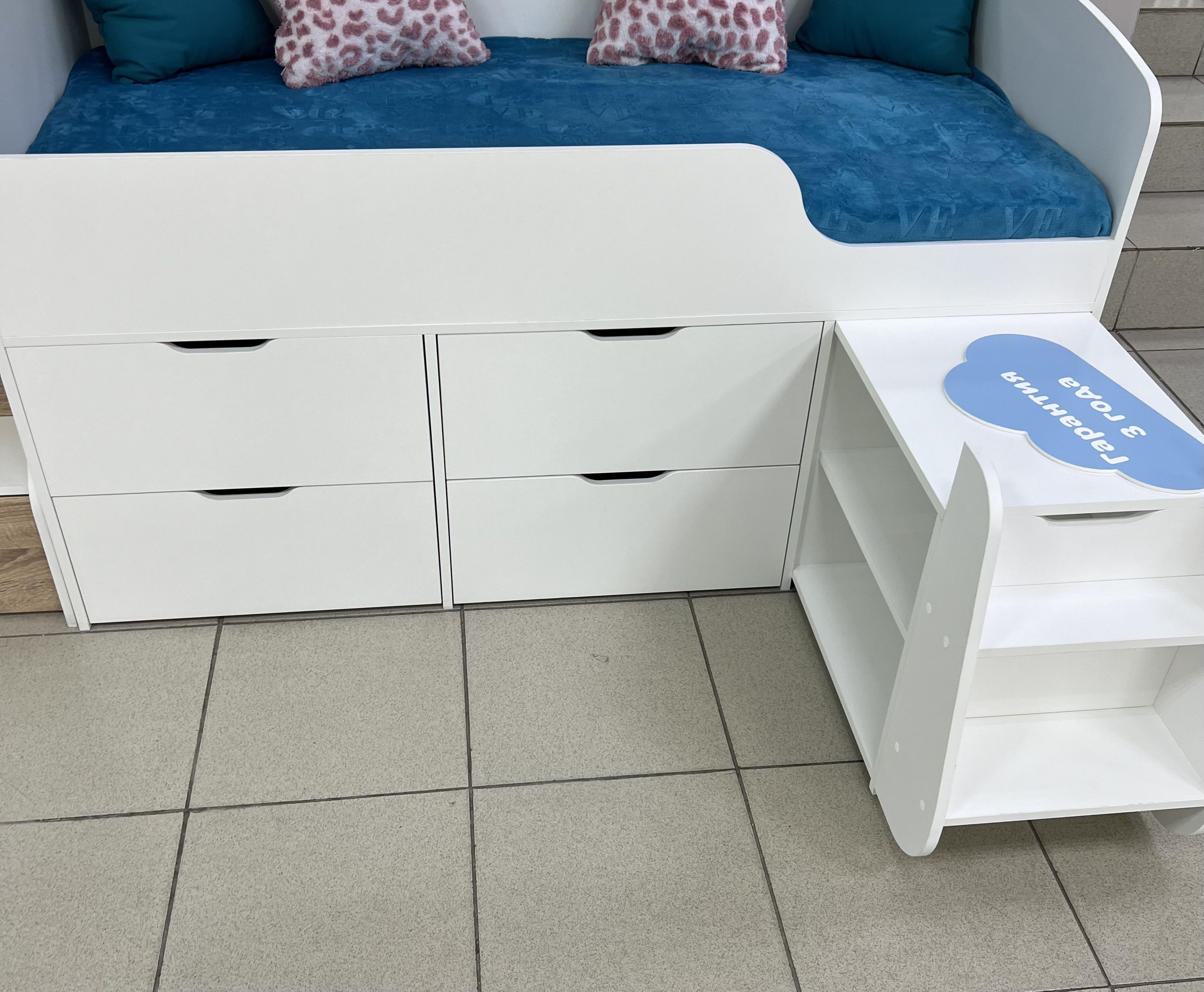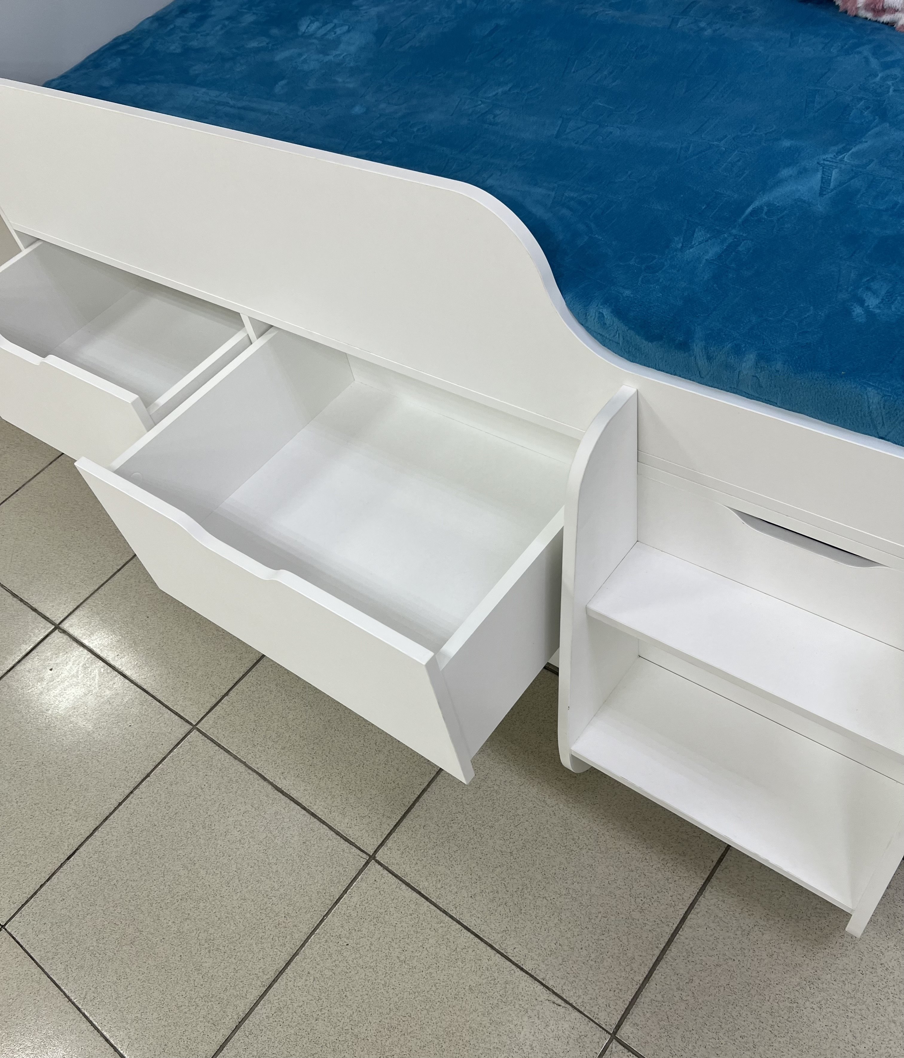 Безопасный, высокий бортик, удобная выдвижная лестница с внутренними полочками и небольшая высота кровати сделаны специально для детей младшего возраста.