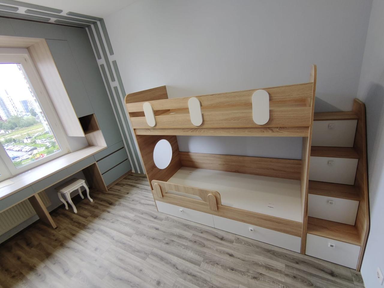 Здравствуйте! Долго искала именно невысокую выдвижную кровать с удобной лестницей. Спасибо вам за такую модель, ящики большие, все помещается.
